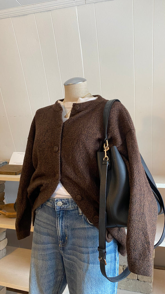 100% alpaca brown black knit cardi good for medium / large (measurements in photos)