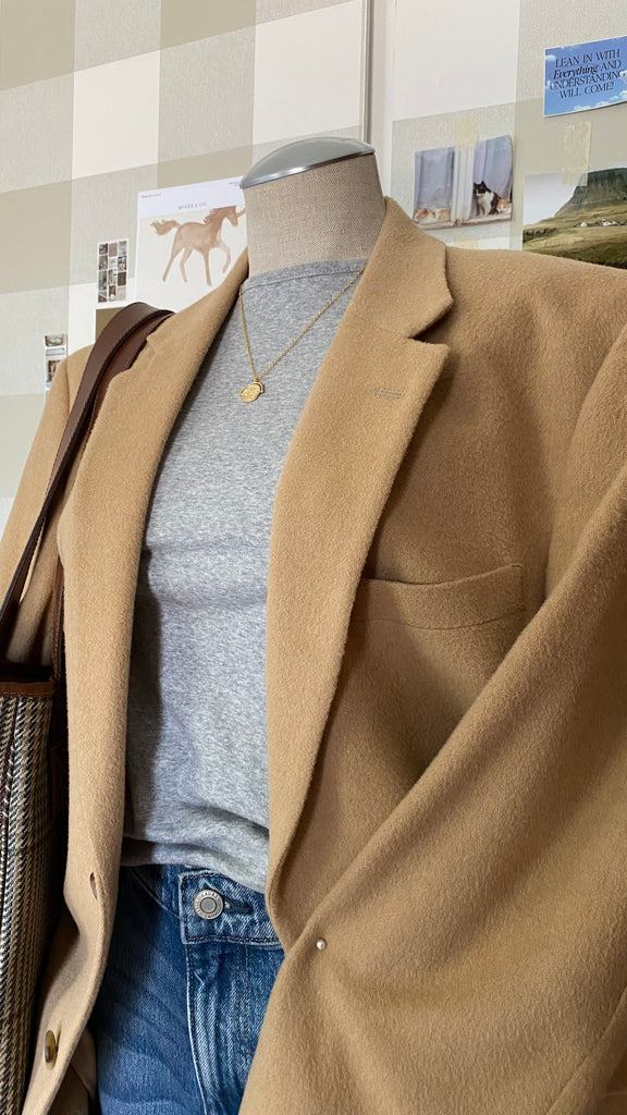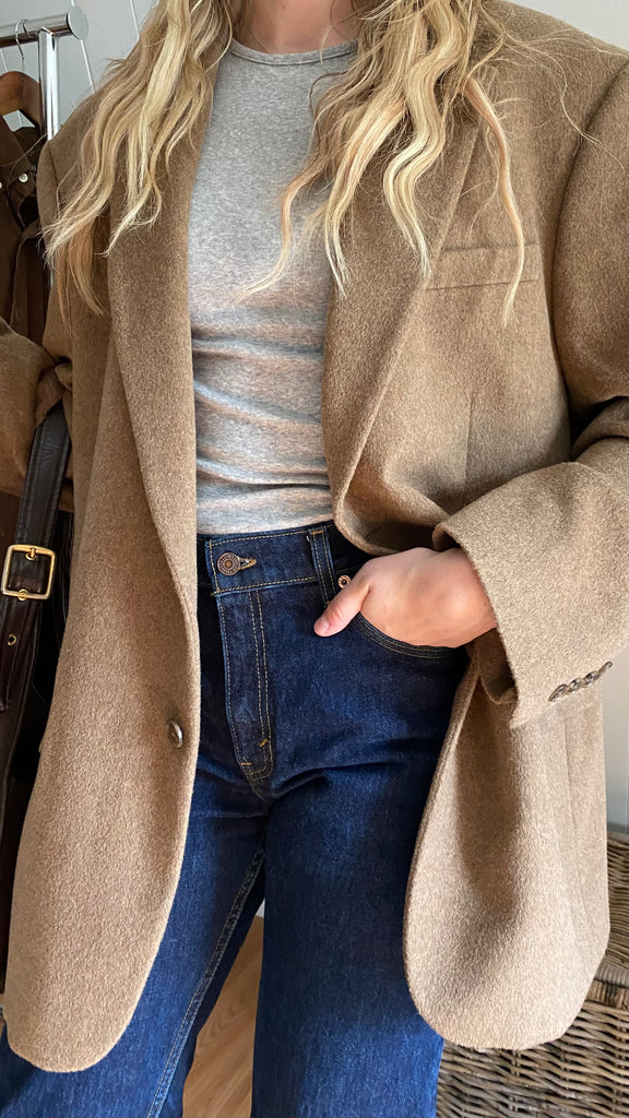 100% camel hair classic blazer great for woman’s xl (measurements in photos) for slight oversized fit very Copenhagen style