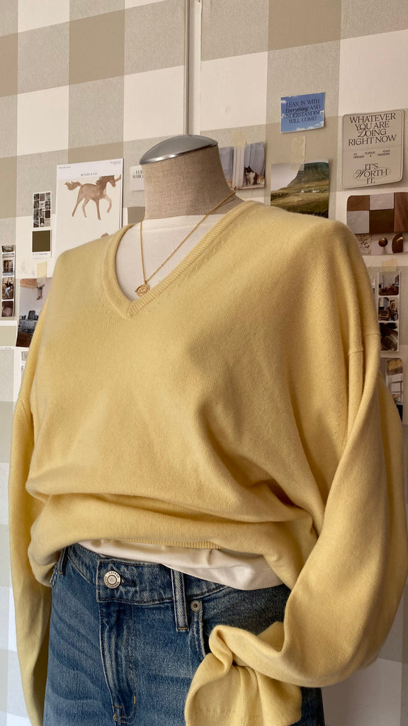 100% cashmere made in Scotland butter yellow sweater good for up to xl (measurements in photos)