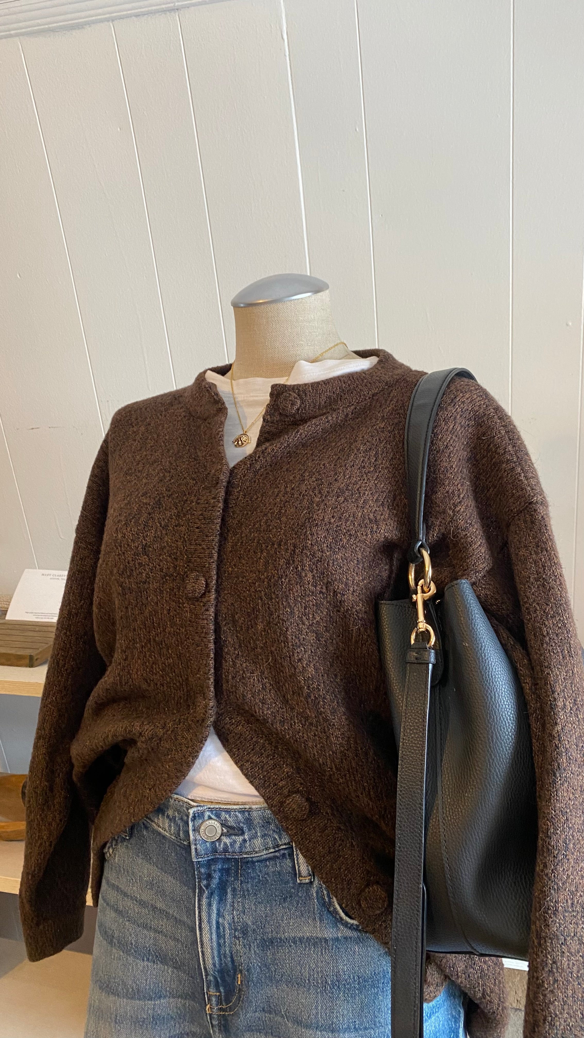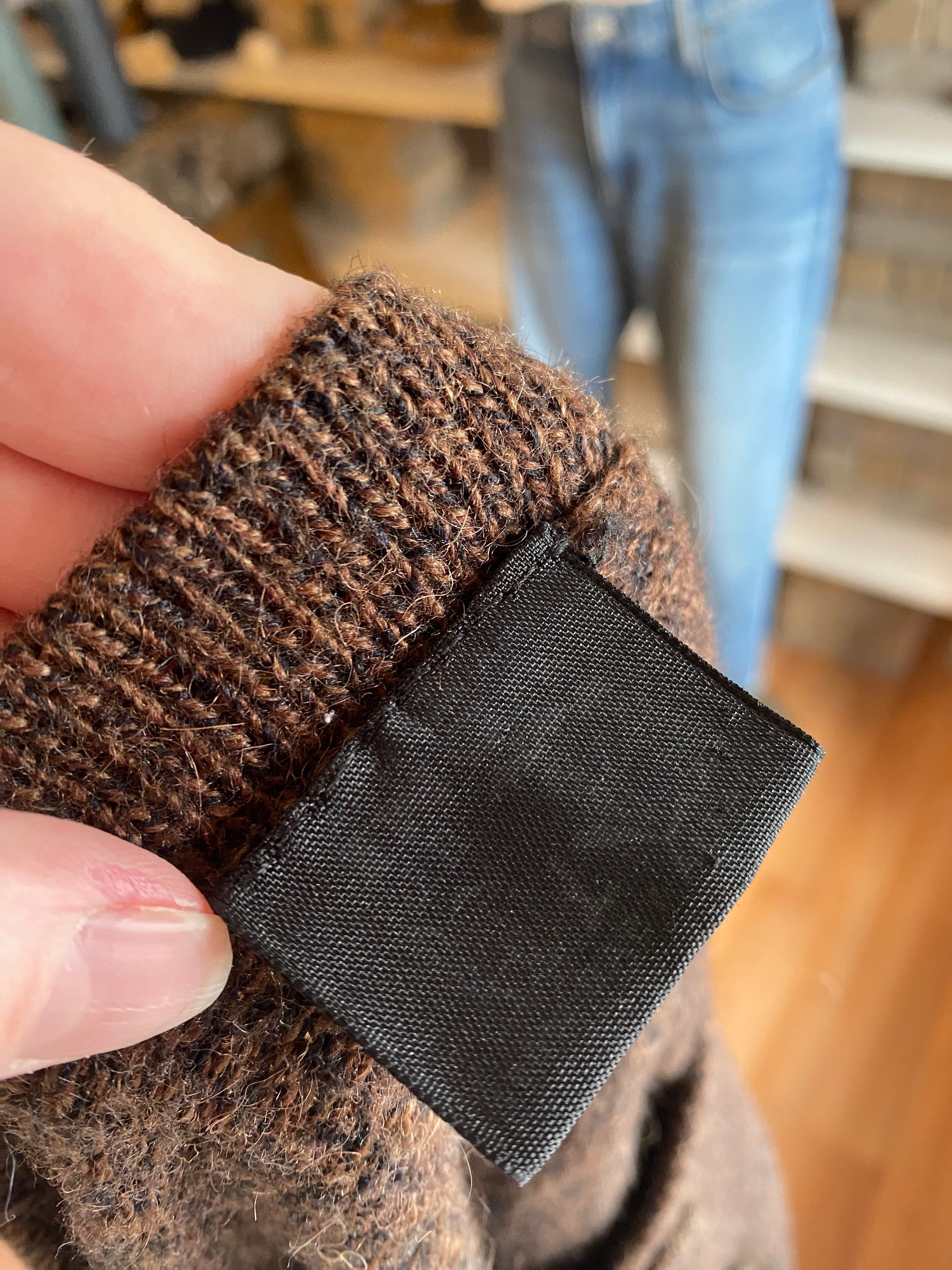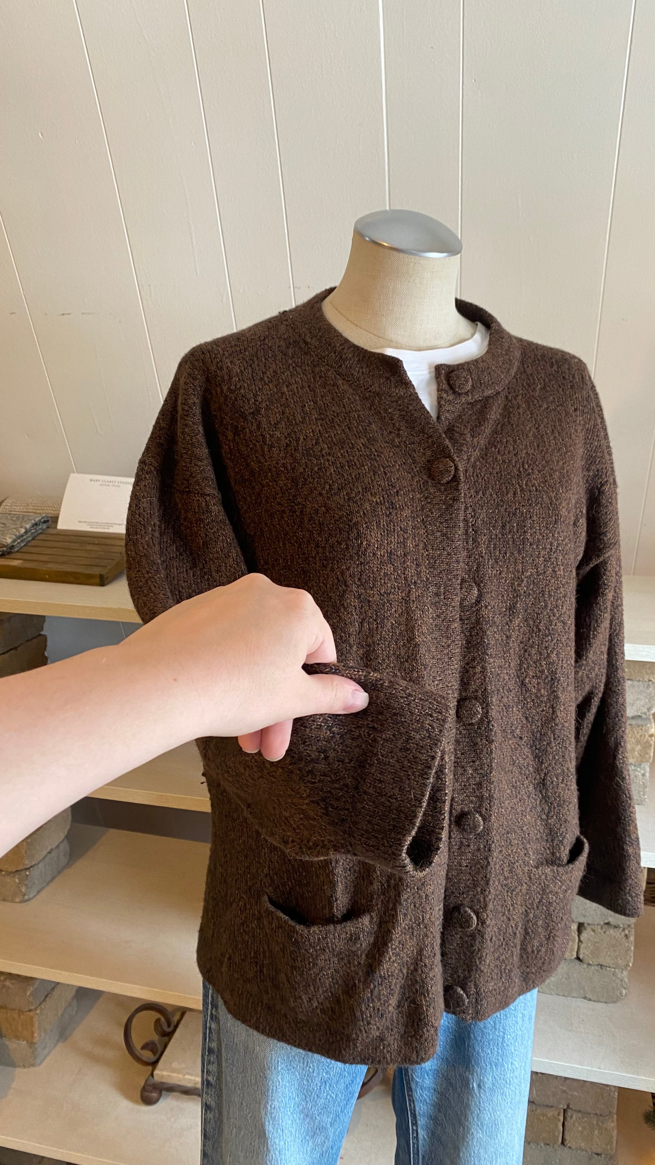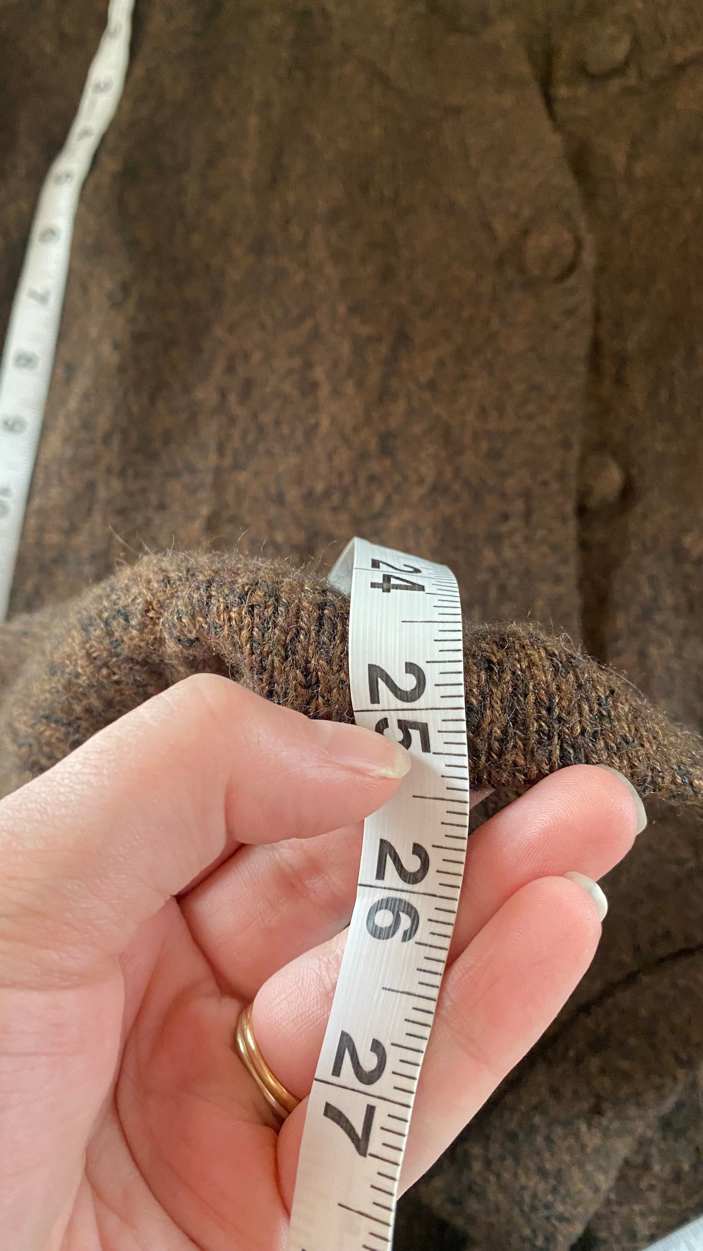 100% alpaca brown black knit cardi good for medium / large (measurements in photos)