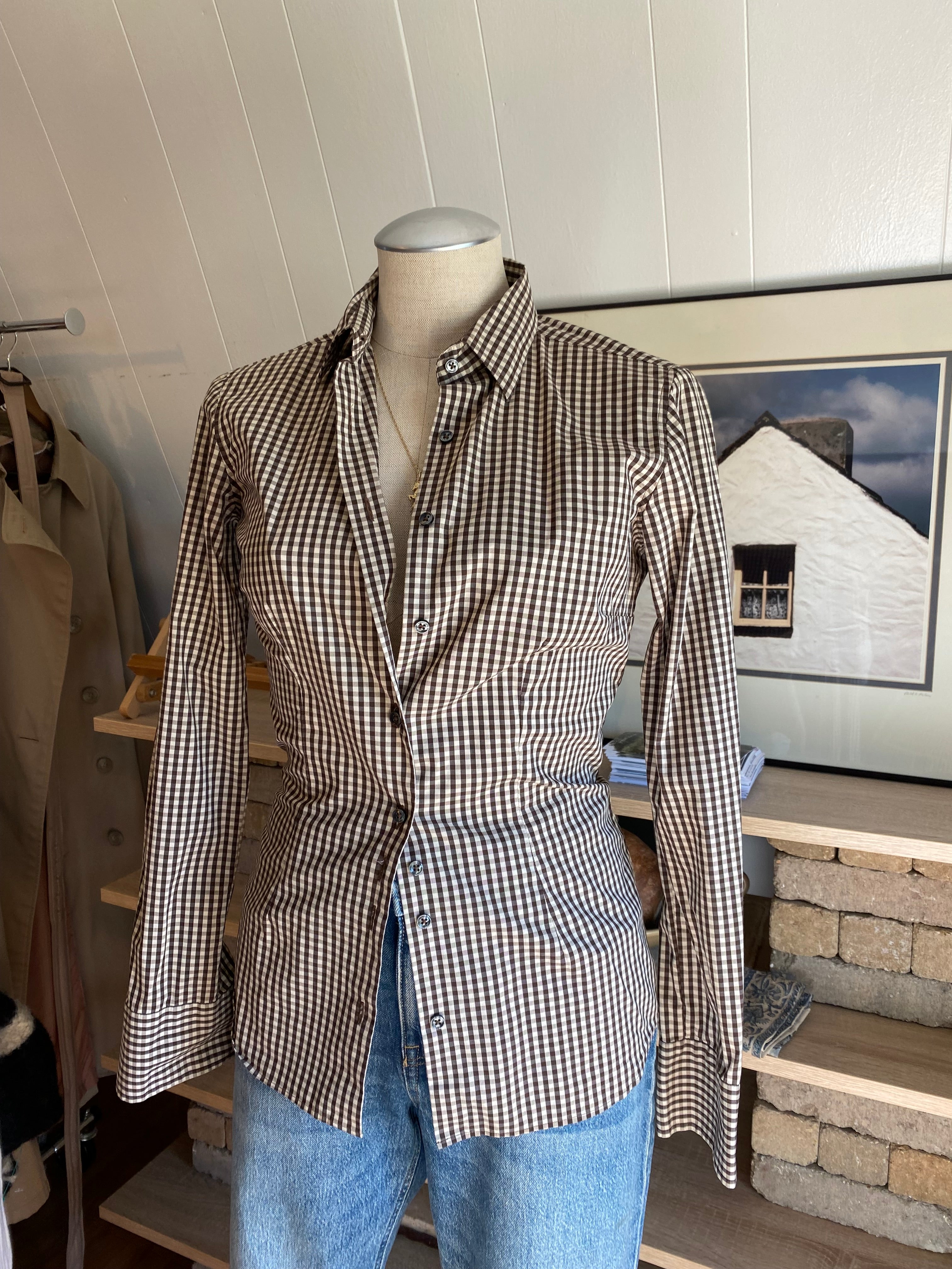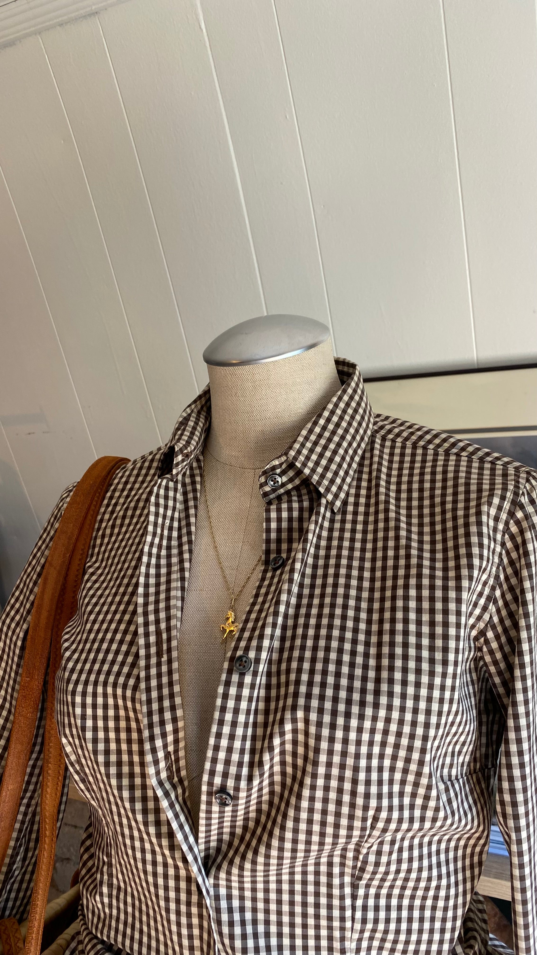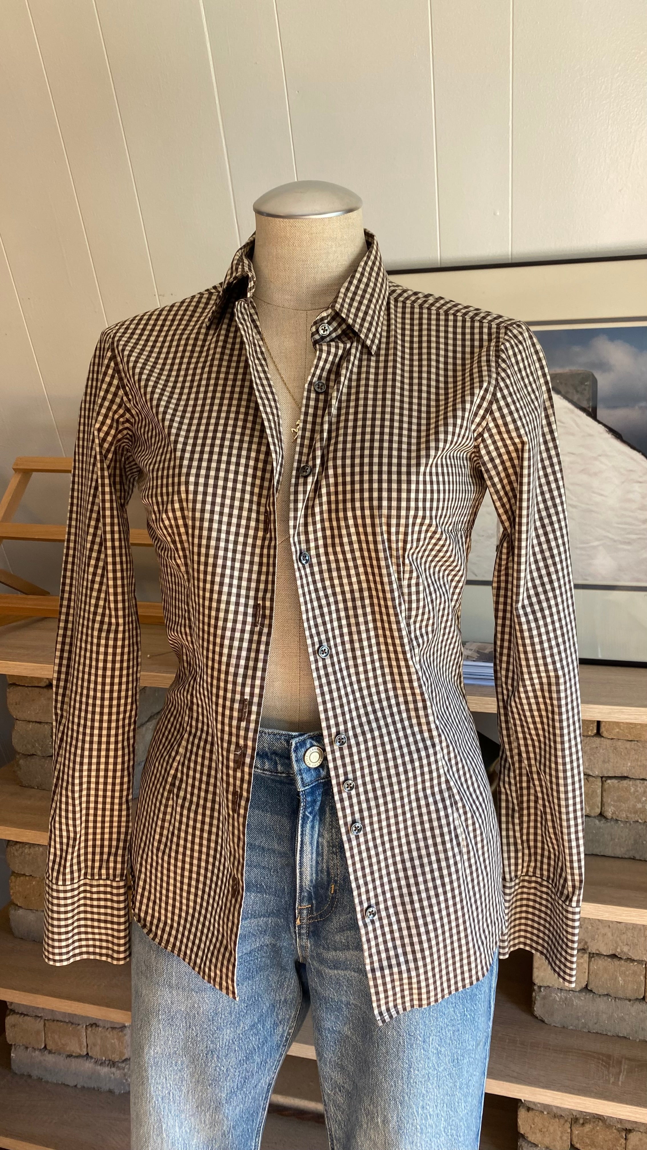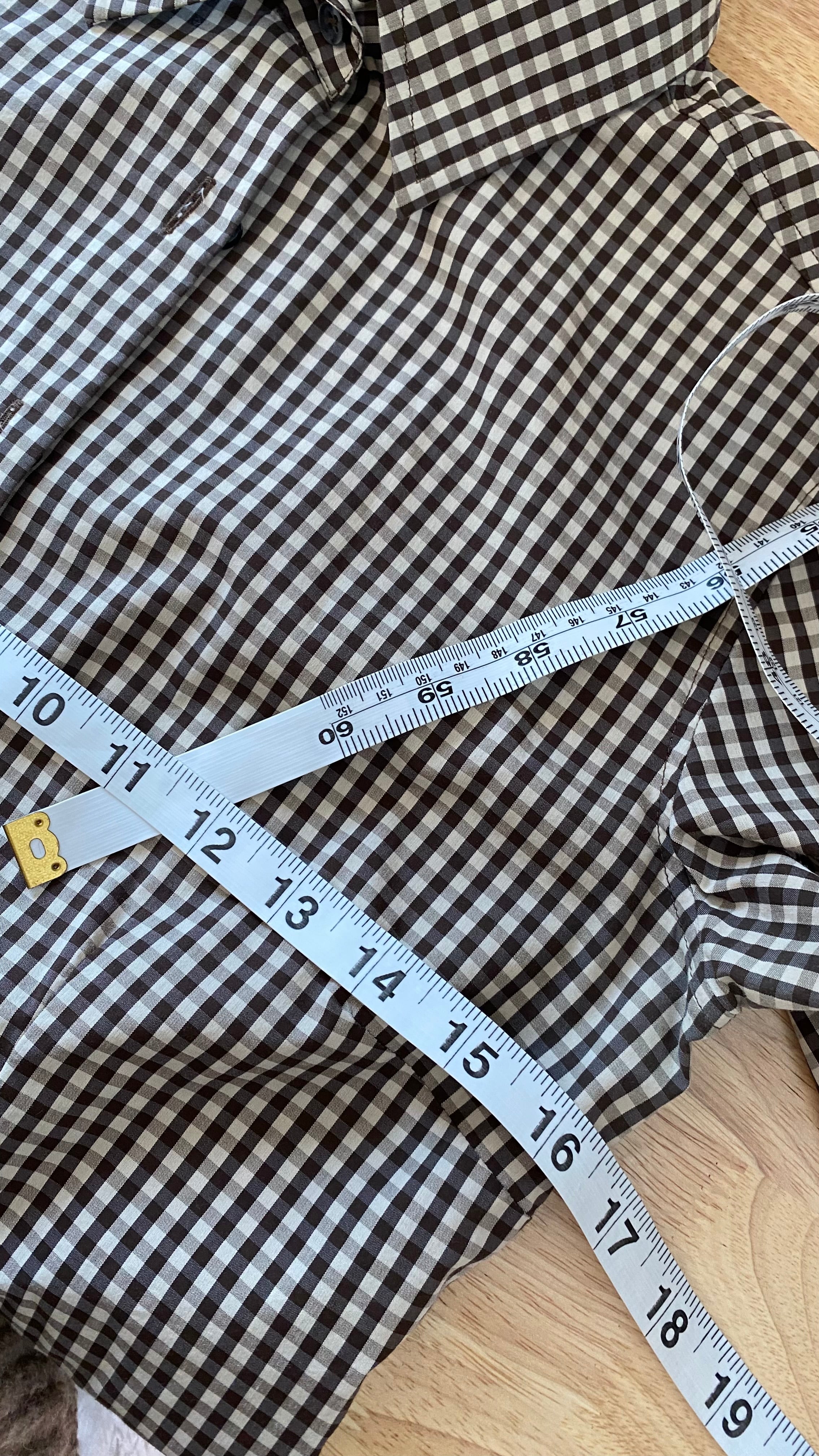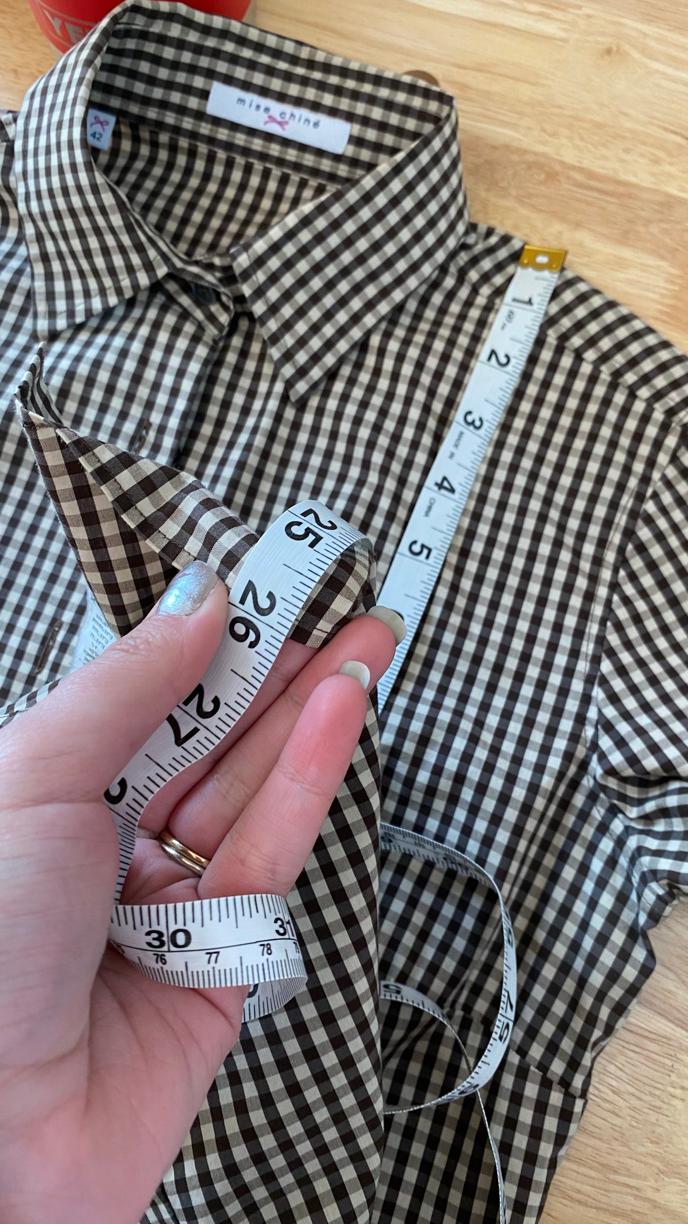 100% cotton brown fitted plaid button up good for size xs / small (measurements in photos)