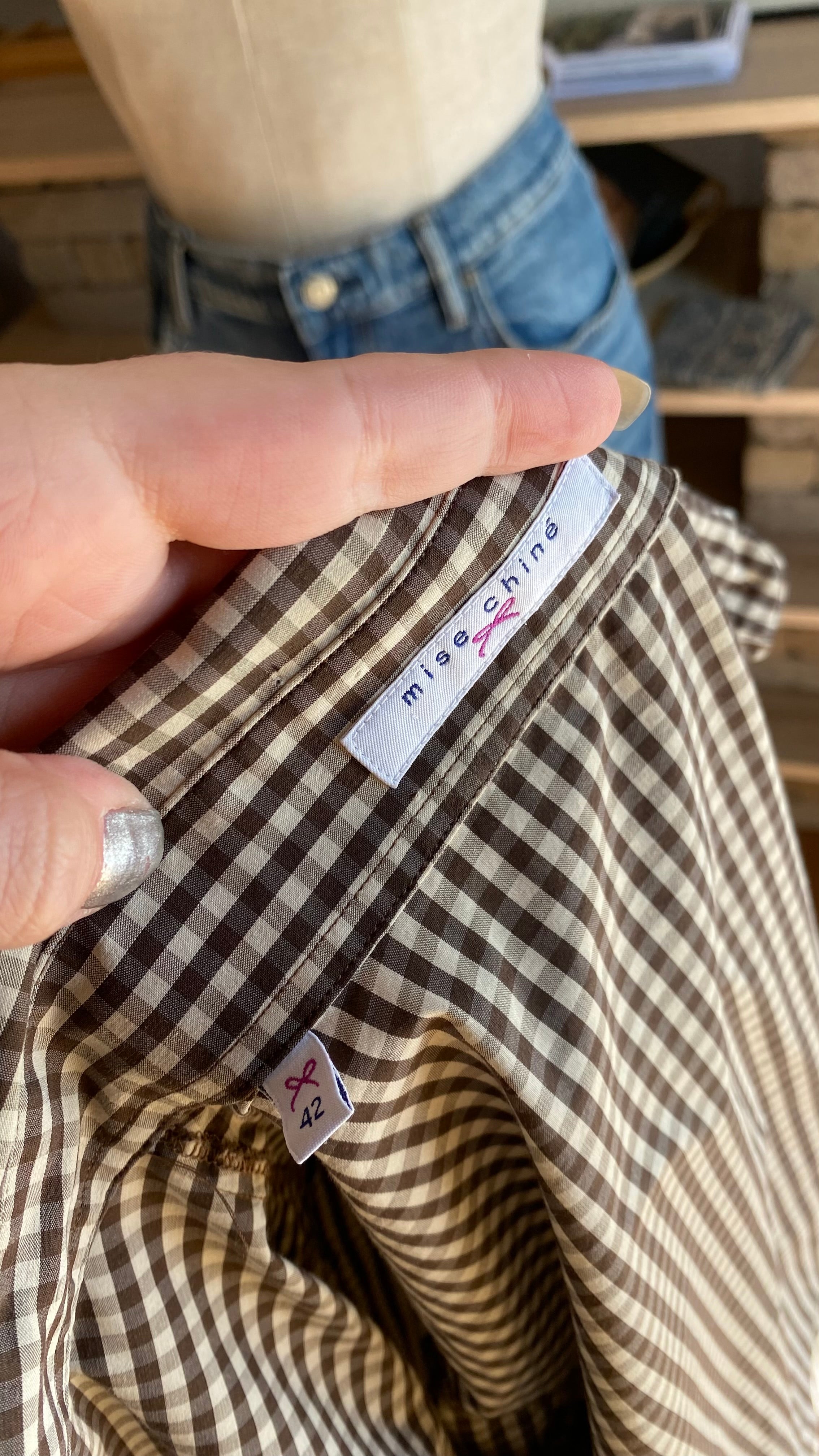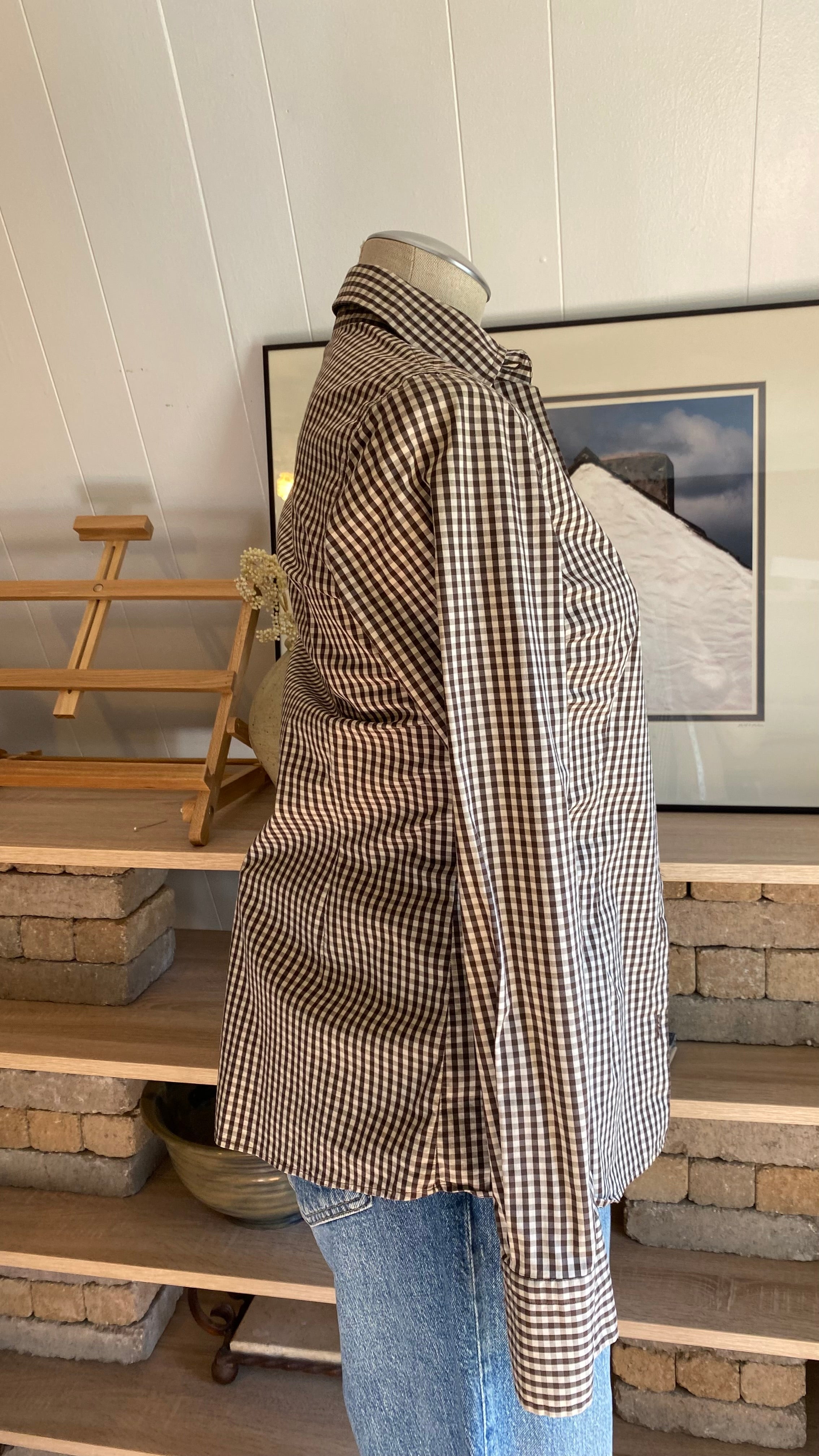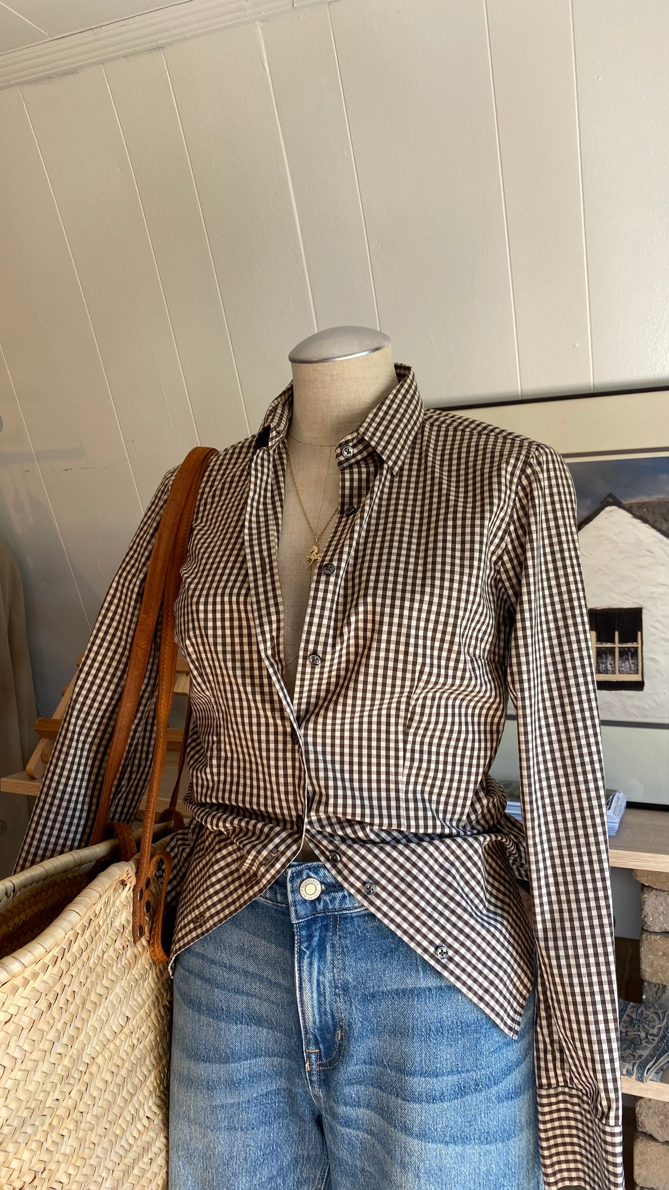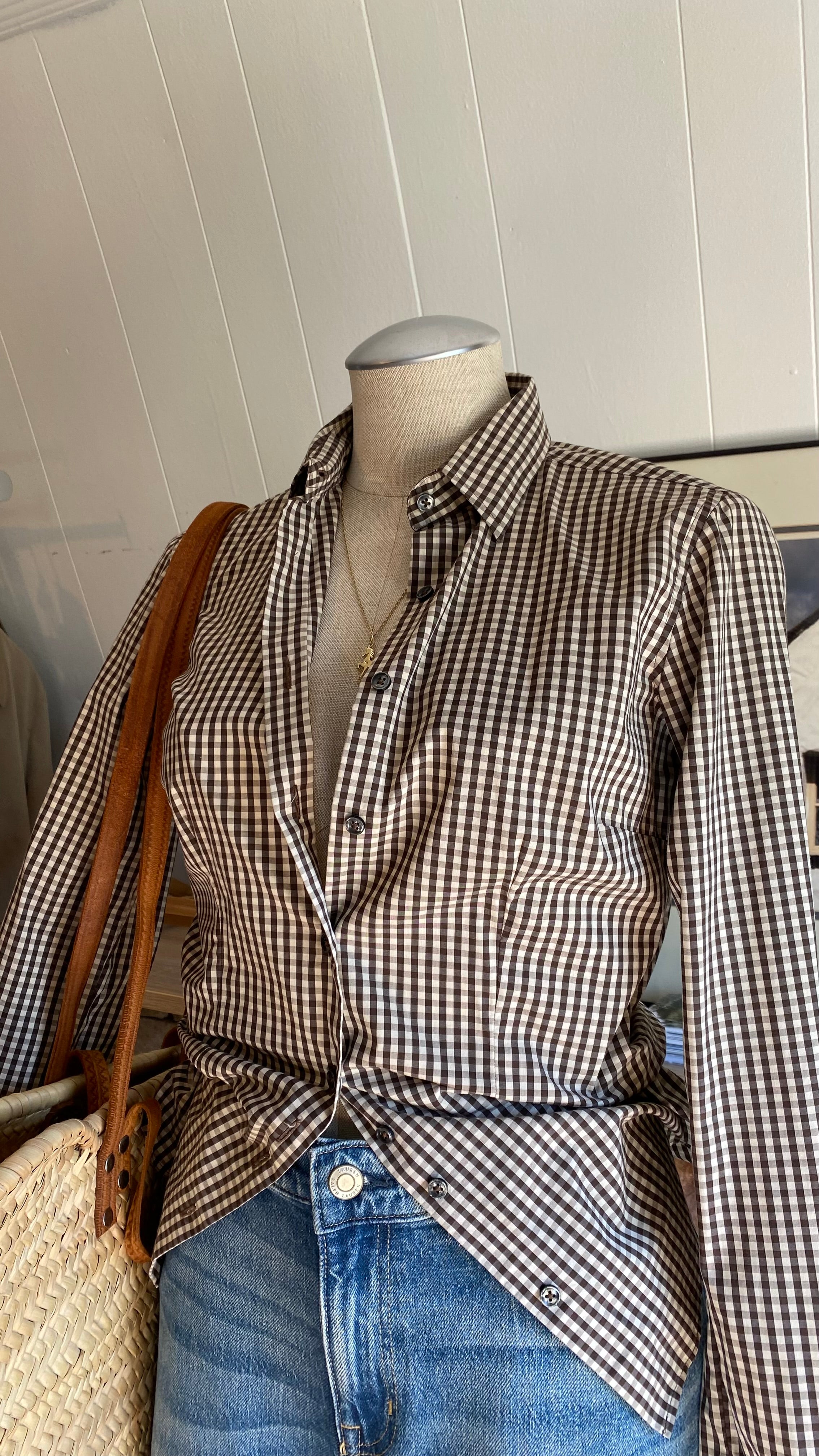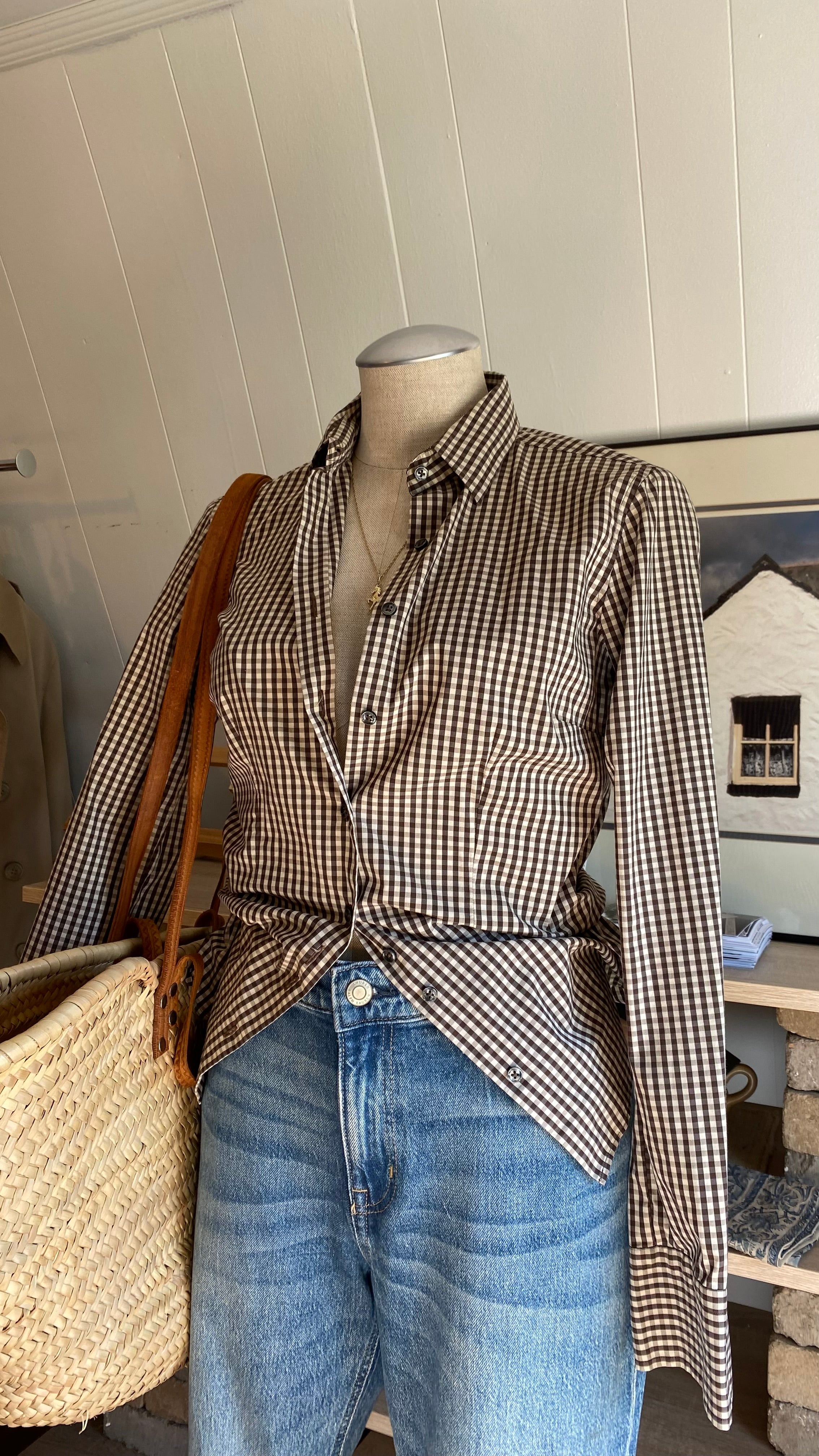 100% cotton brown fitted plaid button up good for size xs / small (measurements in photos)