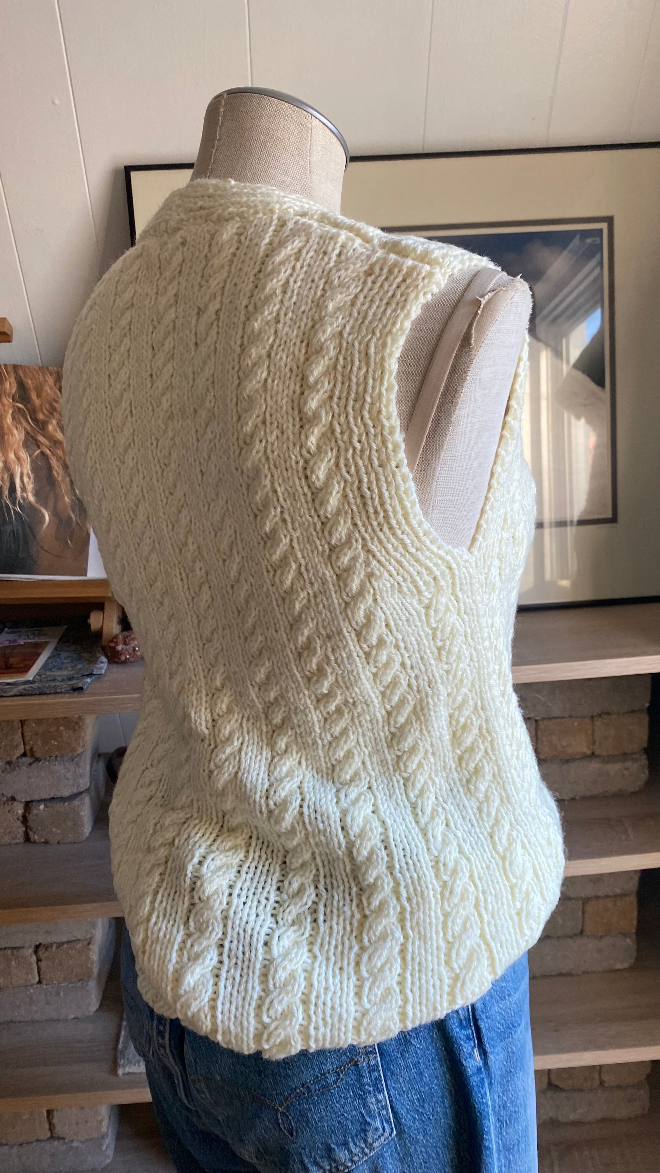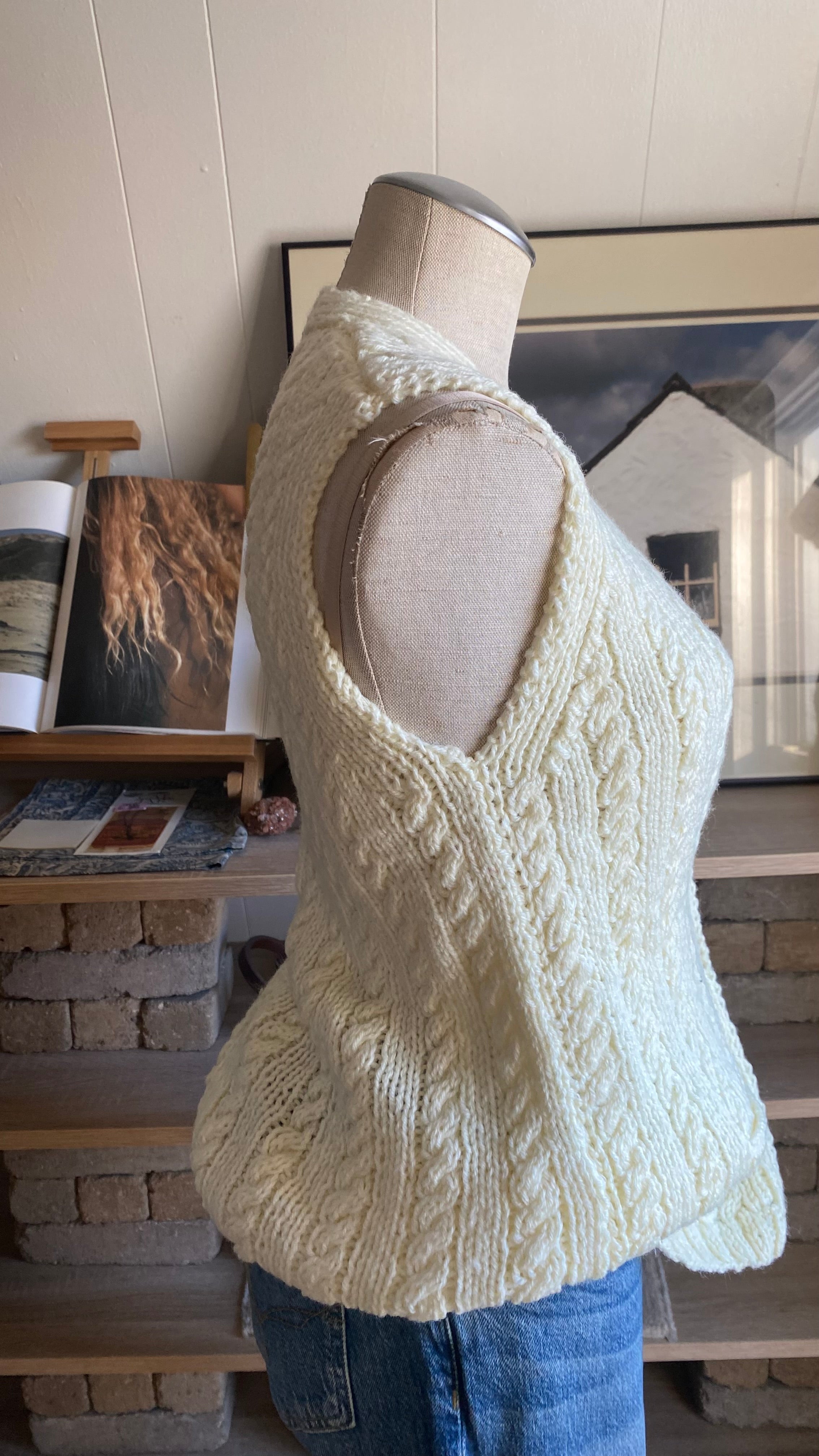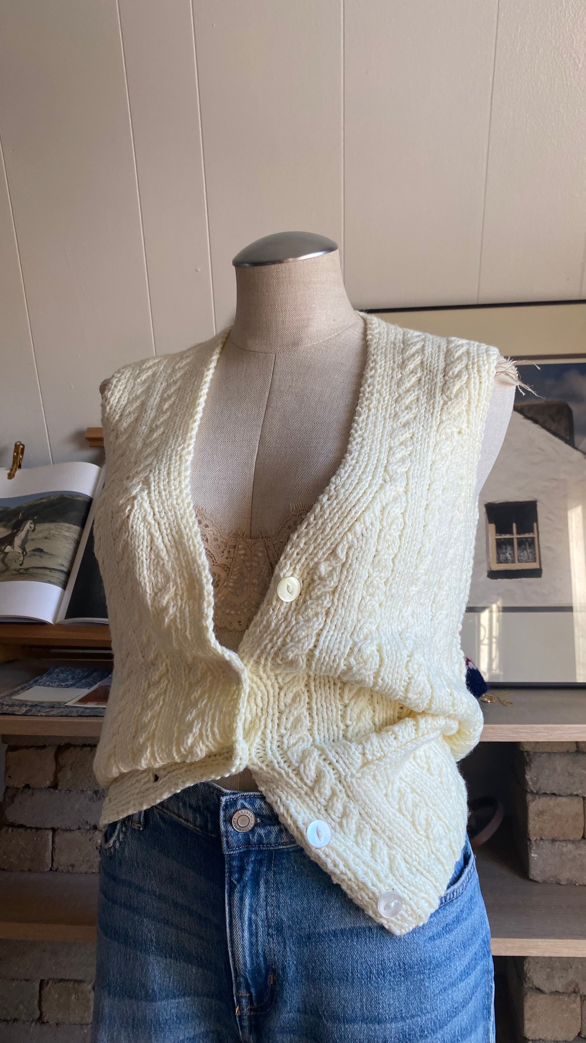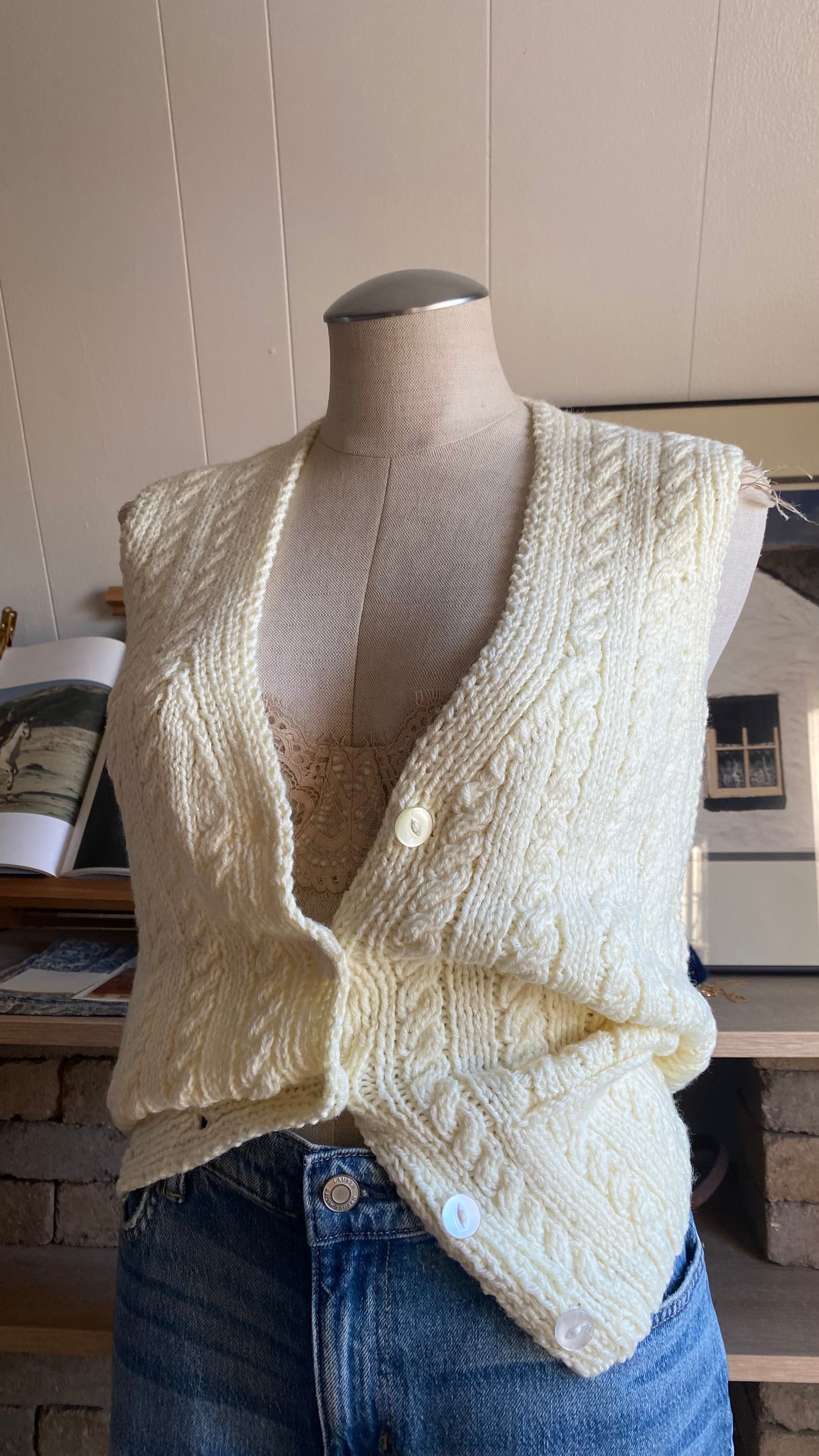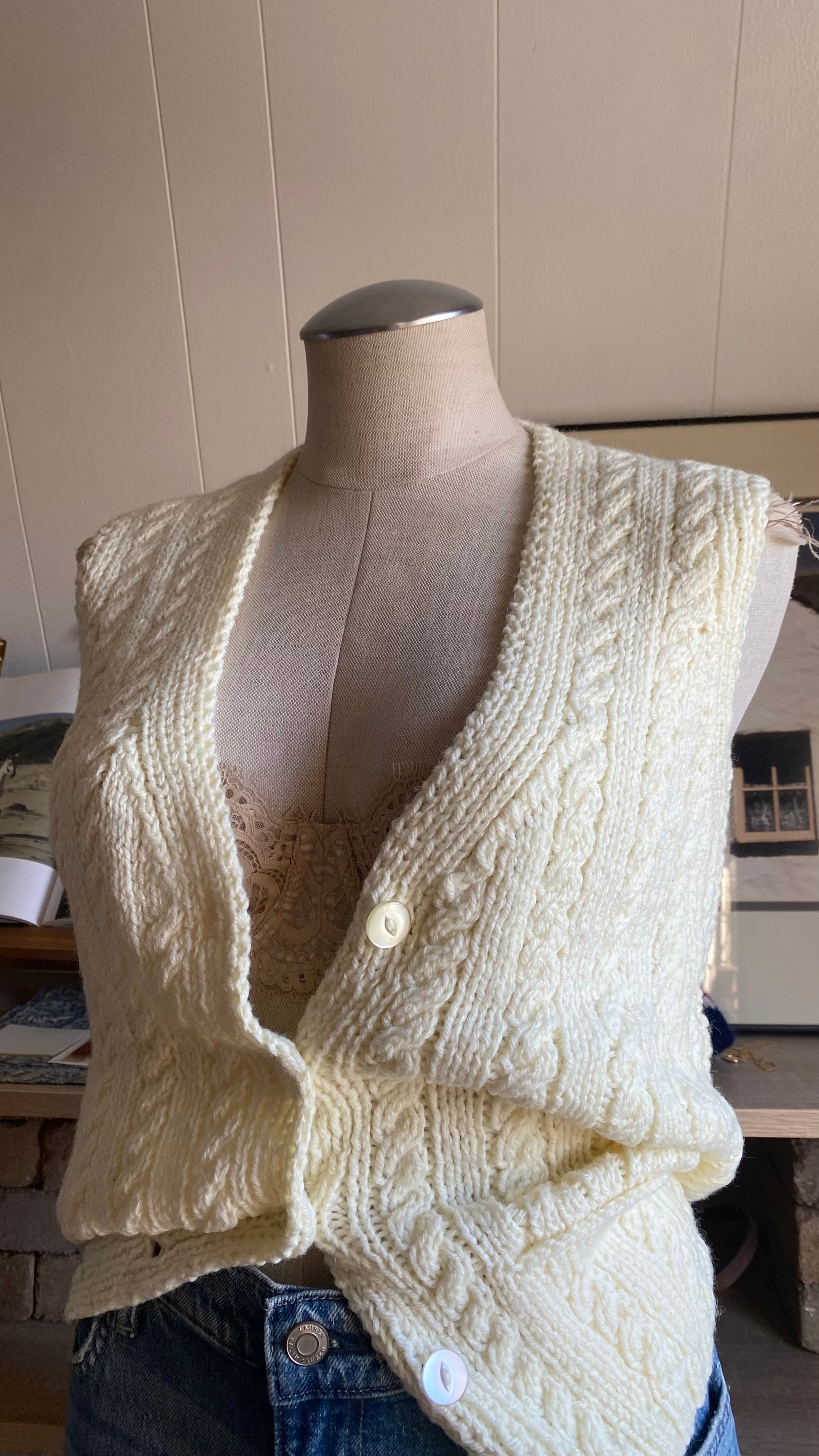 Handknit cream button up sweater vest good for size small/medium